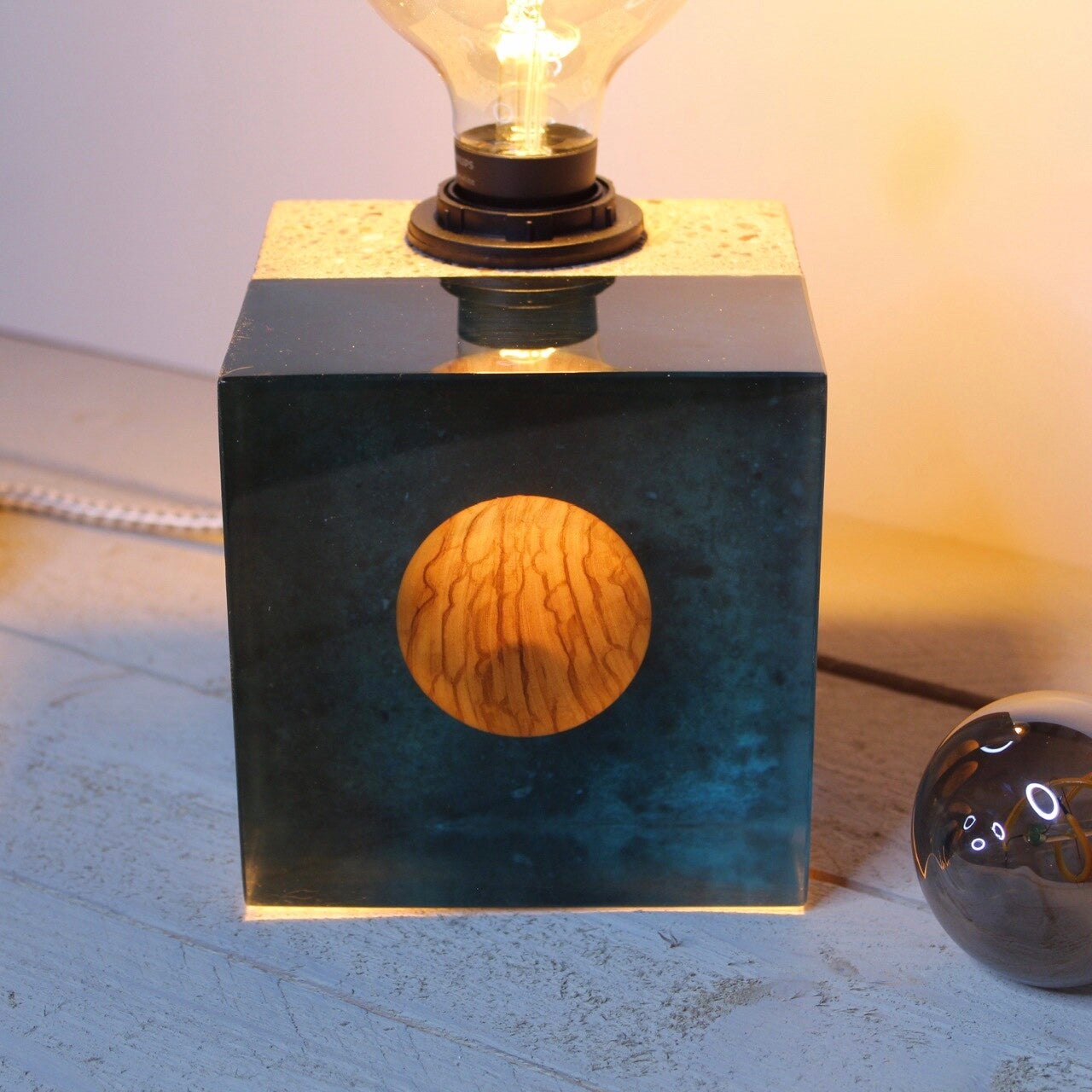 Tischleuchte Material Beton, Epoxidharz und einer Olivenholzkugel. Ohne Leuchtmittel.